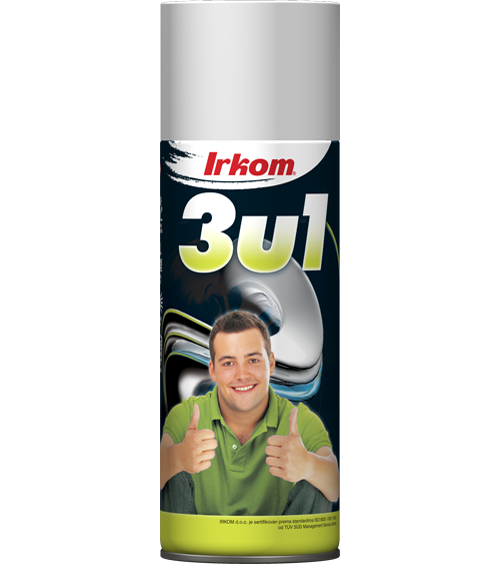 Irkom 3u1 sprej je brzosušiva akrilna boja, laka za korišćenje, prikladna za unutrašnju i spoljašnju upotrebu. Odlikuje se karakteristikama Irkom 3u1 boje i može se koristiti za farbanje onih površina do kojih se farbanjem četkom ili valjkom nije moglo prići. Odlična je za zaustavljanje korozije na metalu. Prijanja na različite vrste materijala: metal, drvo, plastiku, staklo itd. Pruža elastičan i trajan film. Proizvodi se u skoro svim nijansama kao i Irkom 3u1 boja.