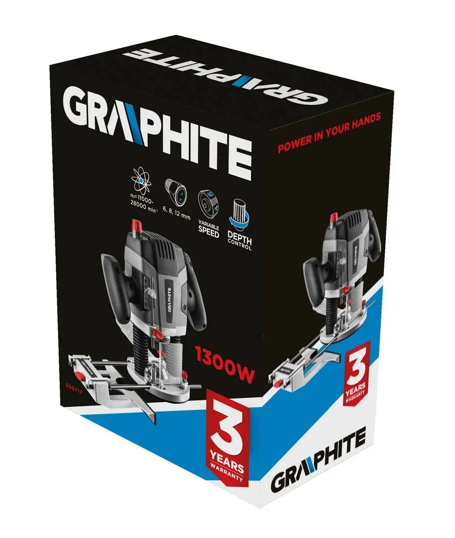 GRAPHITE glodalica sa moćnim motorom od 1300 W, dizajnirana za glodanje rupa, žlebova, ivica i profila u svim vrstama drveta i materijala na bazi drveta, kao i u plastici i aluminijumu. Uređaj ima funkciju kontrole brzine i dubine glodanja. Raspon brzine u praznom hodu je od 11.000 do 28.000 min-1. Usmerivač ima blokadu vretena i blok dubine glodanja. Dubina glodanja može se podesiti pomoću tri instrumenta: 8-stepeni krajnji graničnik, ograničivač dubine sa glatkim podešavanjem (opseg 0-55 mm) i dugme za precizno podešavanje dubine (tačnost 0,1 mm). Uređaj je opremljen stabilnom aluminijumskom bazom sa plastičnim poklopcem, što omogućava lako rukovanje uređajem na svim vrstama površina. Vođice motora ugrađene su u aluminijumsko telo sa utičnicama koje su podvrgnute specijalizovanoj površinskoj obradi, zahvaljujući čemu uređaj karakteriše povećana preciznost tokom prodiranja. Ergonomske ručke rutera prekrivene su neklizajućim materijalom, tako da je upravljanje uređajem ugodno i sigurno. Pokrivač i adapter za usisavanje prašine napravljeni su od prozirnog polikarbonata. Ruter je opremljen velikim dugmetom za kontrolu brzine koji se nalazi nadomak desnog palca operatera. Na levom ručku glodalice nalazi se ergonomska poluga bloka vođica karoserije, omogućavajući joj upravljanje bez skidanja ruke. Uključeni su u mašinu: ravni ključ, čaura za vođenje za kopiranje prema predlošku, šiljak za kružno sečenje, adapter za usisavanje prašine sa redukcijom, tri stezne čaure prečnika 6, 8, 12 mm, aluminijumska paralelna vođica opremljena specijalnom plastični poklopac, zaštita od ogrebotina i mehanizam koji omogućava precizno podešavanje položaja glodalice prema ivici materijala. Alat je opremljen fleksibilnim i čvrstim kablom za napajanje u gumenom premazu, dužine 3 m, takođe dizajniranom za profesionalne i industrijske primene u zatvorenom i na otvorenom.