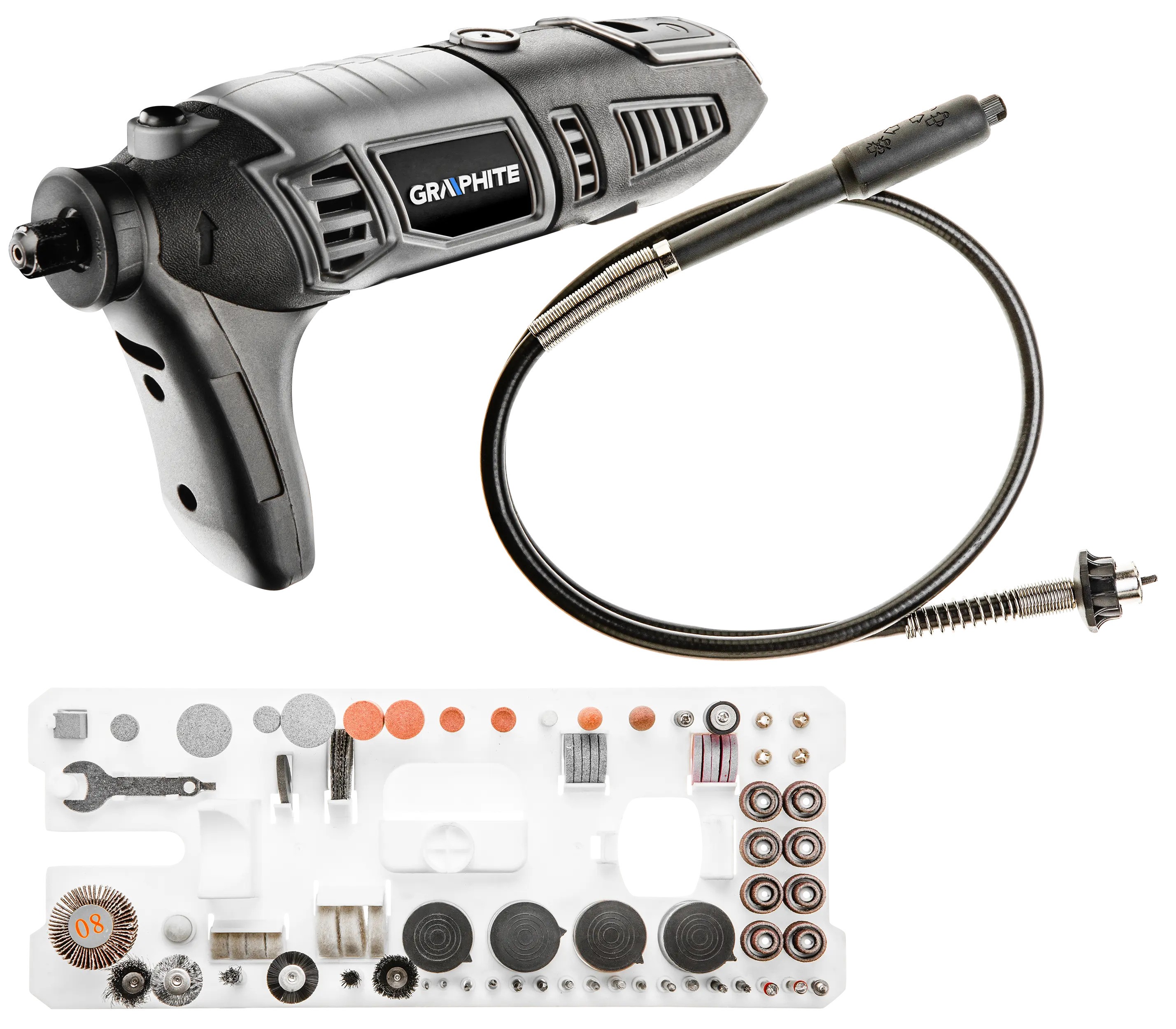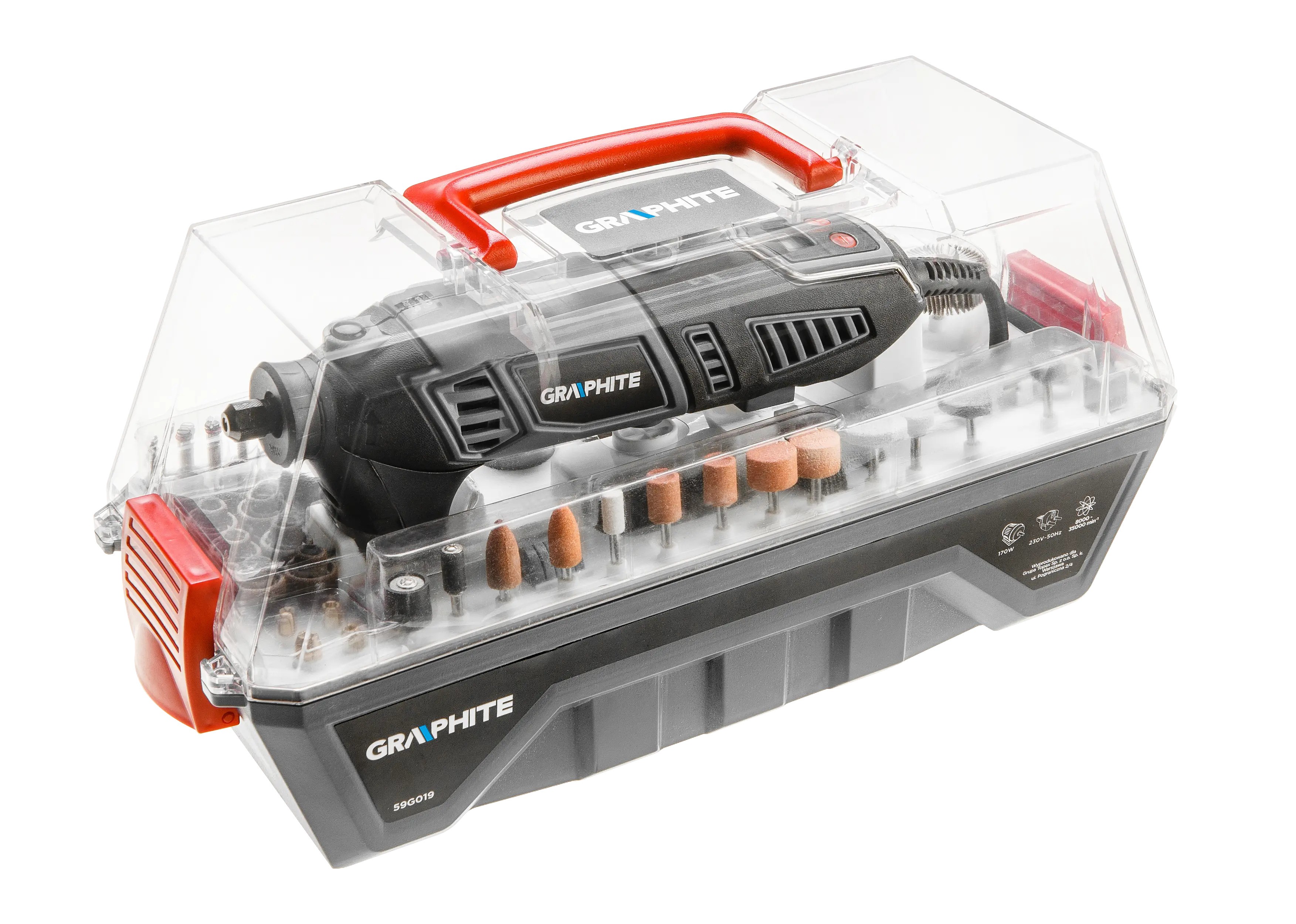 Mini brusilica GRAPHITE, sa motorom od 170 W, funkcionalna je i praktična mini brusilica sa širokim spektrom primena. Omogućava sečenje, brušenje, poliranje i bušenje u raznim materijalima. Ima lagano i ergonomsko kućište i efikasan motor od 170 W koji omogućava izvođenje širokog spektra radionica. Mini-brusilica ima postupno podešavanje brzine rotacije u rasponu od 8.000 do 35.000 o/min. Isporučuje se u estetskom kućištu od plastike i polikarbonata. Mini brusilica ima vrlo bogat set dodatne opreme, poput brusnih kamena, dijamantskih glodala, bušilica, brusilica, filca za poliranje, brusne glave i traka i reznih diskova – ukupno 190 različitih dodataka. Alat je opremljen fleksibilnim i čvrstim kablom za napajanje u gumenom premazu, dužine 3 m, takođe dizajniranim za profesionalne i industrijske primene u zatvorenom i na otvorenom. Opremljen je dodatnom ručkom koja olakšava upotrebu uređaja i fleksibilnim valjkom za precizni rad. Mini brusilica pokrivena je garancijom od 24 meseca.