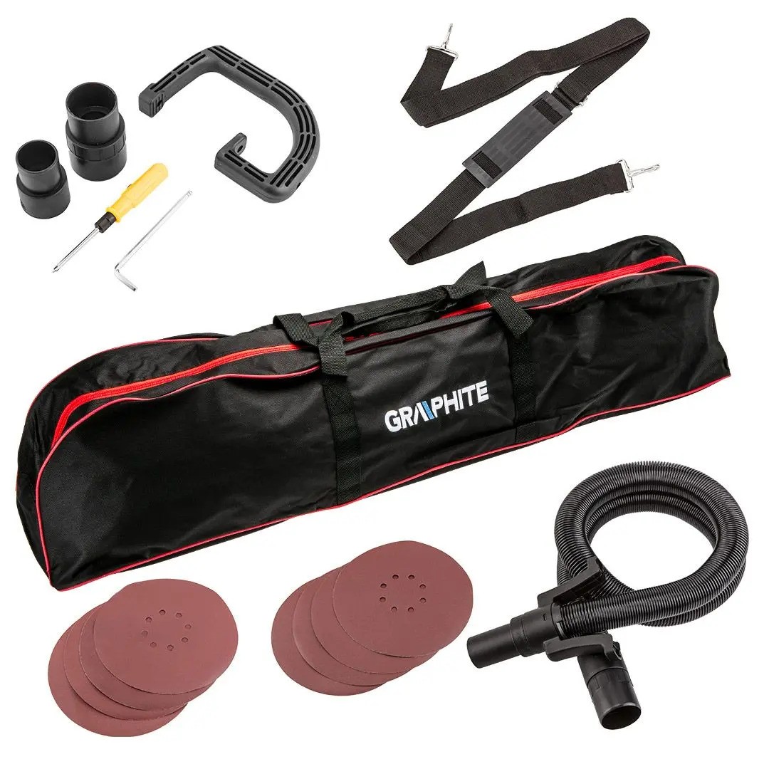 Vrhunska brusilica GRAPHITE za duga doseg sa motorom od 600 W dizajnirana je za obradu gipsanih površina. Brusni točak ima direktan pogon bez međuvratila. Alat omogućava kontinuirano podešavanje brzine rotacije glave u opsegu 600 do 1500 o/min. Prečnik brusnog točka je 225 mm. Produžni krak brusilice je podesiv u opsegu 1100 do 2000 mm. Sistem za usisavanje prašine sa nastavkom za usisivač garantuje čisto i uredno radno mesto. Pored toga, brusilica je opremljena dodatnom podesivom ručkom i kontinuirano podesivom glavom glave sa radnom podlogom. Ručka ima gumene zaštitne podloge za udobnost i stabilnost prilikom brušenja. Radna podloga je zaštićena štitnikom četke za dodatnu sigurnost. Zahvaljujući pričvršćivanju na kuku, zamena istrošenog brusnog papira je trenutna. Brusilica za dugo dosezanje ima dugački kabl za napajanje od 5 metara i elastično usisno crevo koje se može razvući od 1,2 do 4 m. Zaštitna vilica postolja za usisno crevo ima funkciju postolja brusilice tokom pauza na poslu. Set brusilice uključuje: Brusni papir, usisno crevo, produžnu ruku, redukcione čaure, naramenicu i meku vreću.