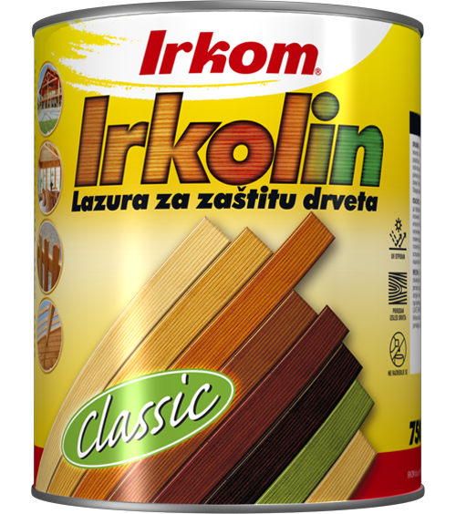 IRKOLIN CLASSIC je tankoslojni lazurni transparentni premaz bez laka koji se koristi za dekoraciju i intenzivnu dubinsku zaštitu drveta u enterijeru i eksterijeru (prozori, vrata, ograde, lamperija). Štiti drvo od vode i atmosferskih uticaja i daje mu željene estetske karakteristike. Zbog velike količine pigmenta koji sadrži, izuzetan je za nijansiranje drveta, a tečni sadržaj mu omogućava duboko prodiranje u strukturu drveta. Može se koristiti samostalno, preporučuje se u enterijeru 1-2 sloja, u eksterijeru 2-3 sloja ili kao podloga za Irkolin Gold (u tom slučaju nanosi se u samo jednom sloju u istoj nijansi kao i Irkolin Gold). Ukoliko želite nijansirati drvo može se premazati i u više slojeva od preporučenog, svaki novi naneti sloj dovešće do intenziviranja nijanse uz minimalan gubitak transparentnosti. Nanosi se četkom, krznenim valjkom ili špricem.