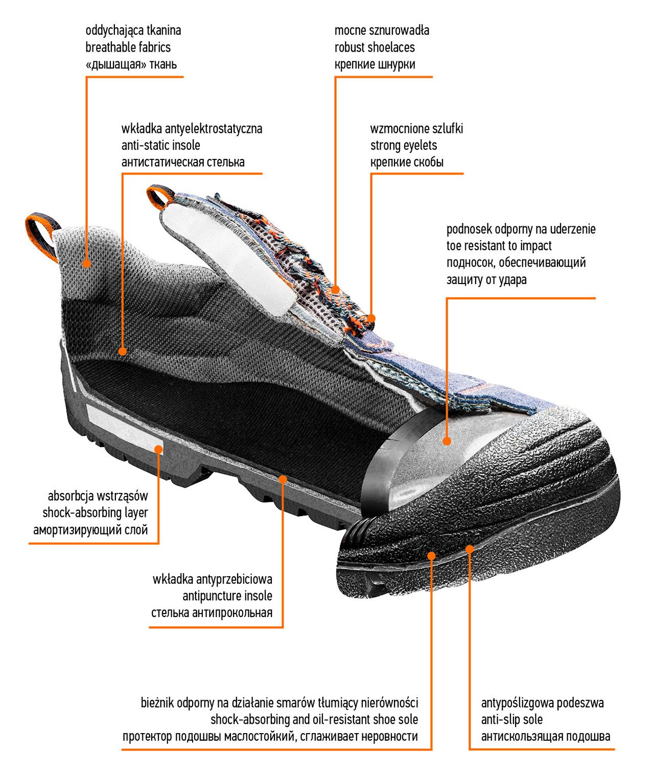 Radne cipele pružaju osnovnu zaštitu na radu. Gornji deo je izrađen od visokokvalitetnog antilopa. Ulošci materijala koji diše pružaju dobru ventilaciju. Protivklizni đon je opremljen sistemom za amortizaciju, pruža sigurnost i udobnost. Metalni umetak za probijanje i ojačani metalni nožni prst štite od mehaničkih povreda. Mekana unutrašnja završna obrada omogućava uživanje u visokom komforu na poslu.