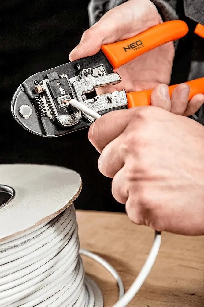 Klešta telefonska dužine 195 mm. Sa izmenjivim glavama za stezanje 4P, 6P i 8P konektora. Sečiva su izrađena od izdržljivog čelika SK5 tvrdoće 42-48 HRC. Ručka je presvučena visokokvalitetnom TPR plastikom koja poboljšava udobnost rada.