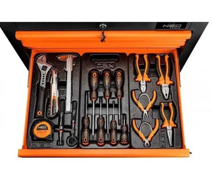 Orman za alat NEO TOOLS sa alatom (ref. br. 84-223+G) dimenzija 770 x 460 x 870 mm. Orman ima 6 praktičnih fioka sa alatom, zaključanih centralnom bravom. Sve fioke se potpuno otvaraju, imaju kuglice za vođice, što omogućava dugotrajan, tečan i pouzdan rad. Fioke se čuvaju blokadom sa začepljivanjem, što obezbeđuje sigurnost životne sredine tokom transporta. Površina radnog prostora prekrivena otpornim kompozitom zajedno sa nišom za sitnice i namenskim mestom za stege povećavaju upotrebljivost proizvoda. Uglovi protiv pucanja obezbeđuju sigurnost životne sredine. 5 inča, tihi, okretni točkovi pojednostavljuju manevrisanje, dodatno su opremljeni kočnicom. Nosivost 200 kg. Ormar opremljen udobnim gumenim držačem koji olakšava vođenje. Pouzdanost proizvoda potvrđeno sa 25 godina garancije proizvođača. NEO brend ispunjava očekivanja profesionalaca.