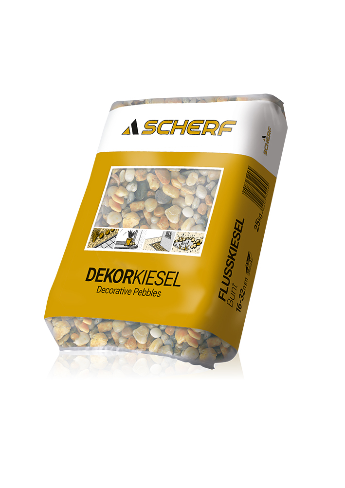 Scherf - Rečni kamen 16-32mm - 25kg / Šareni je visokokvalitetno kamenje i pesak koje će uneti šarenilo i prirodni izgled u vaš pejzaž. Njegova glavna namena je za dekoraciju eksterijera, uređenje dvorišta, bašta, staza, terasa i ostalih prostora u kojima želite da postignete autentičan prirodni izgled.
